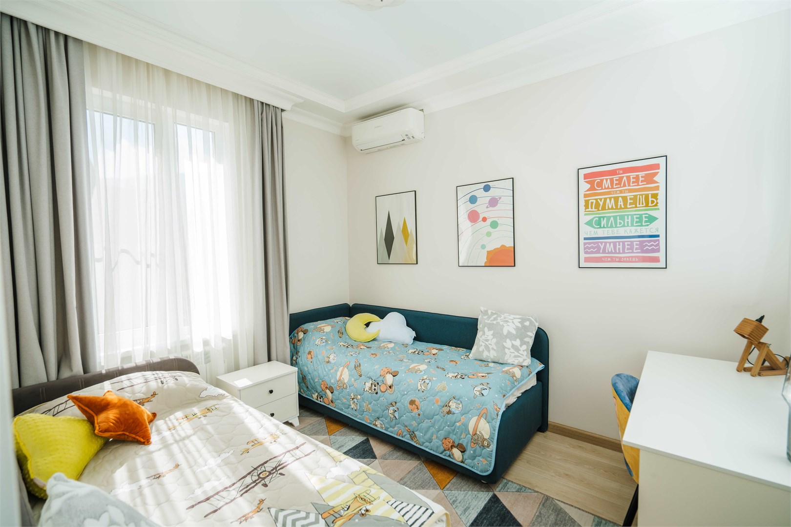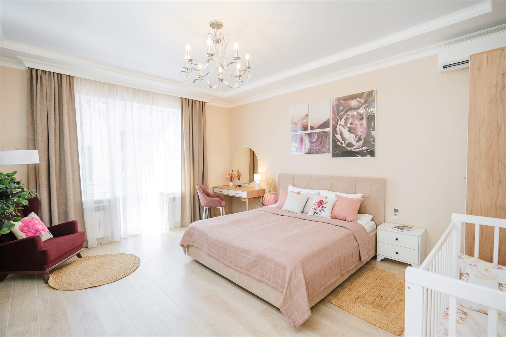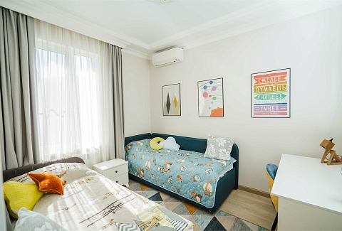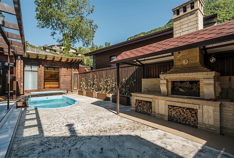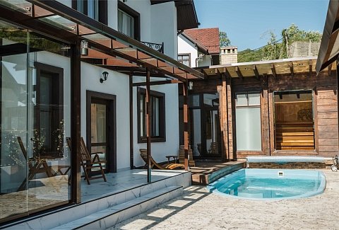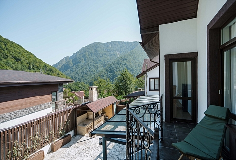 На первом этаже находятся кухня, гостиная, санузел, прихожая и вместительная гардеробная. В гостиной стоит мягкий удобный диван и smart‑телевизор. Кухня оснащена холодильником, кофеваркой, чайником, большим набором посуды и столовыми приборами, а выход отсюда ведёт во двор к мангальной зоне и крытой беседке. В санузле — душевая зона, туалет, полотенцесушитель, раковина с зеркалом. В прихожей установлена стиральная машина, есть гардероб для одежды и пространство для багажа. Здесь же расположена первая спальня. На втором этаже — три спальни и санузел. Во второй спальне стоит двуспальная кровать 180×200 и smart‑телевизор, есть выход на балкон с видом на горы. Третья спальня с кроватью 160×200 и smart‑телевизором также имеет балкон с горным пейзажем. Четвёртая спальня детская — с двумя односпальными кроватями и письменным столом. Третий, мансардный этаж зонирован на две части: в одной за массивным шкафом установлена кровать, а другая представляет собой игровую зону с двумя раздвигающимися креслами, пуфиками, настольными играми и телевизором. Двор дома озеленён, выполнен фасадная и придомовая подсветка. Предусмотрена парковка и видеонаблюдение по всему периметру. Обустроена мангальная зона с раковиной и рабочей поверхностью, крытая беседка с видом на горы и инфракрасными лампами для поддержания тепла зимой, а также садовая мебель. Круглогодично работает подогреваемый бассейн с зоной отдыха и лежаками. Панорамная баня открывает потрясающий вид на ущелье. В доме есть закрытая терраса.