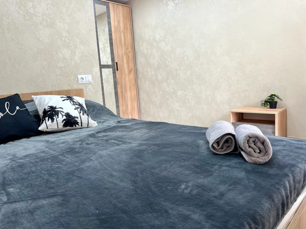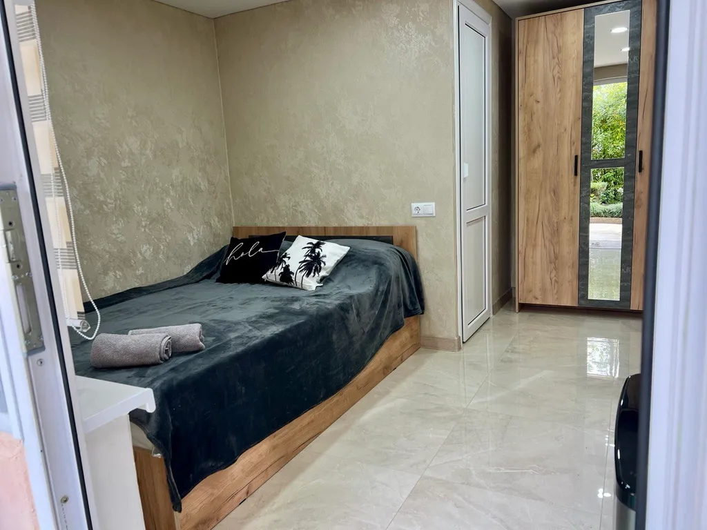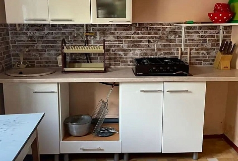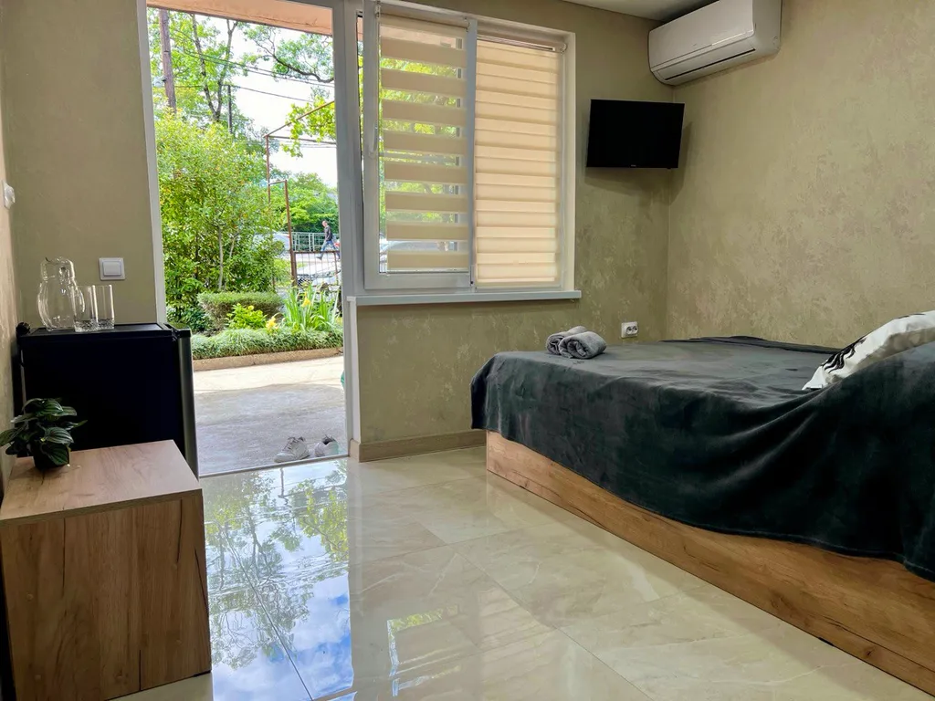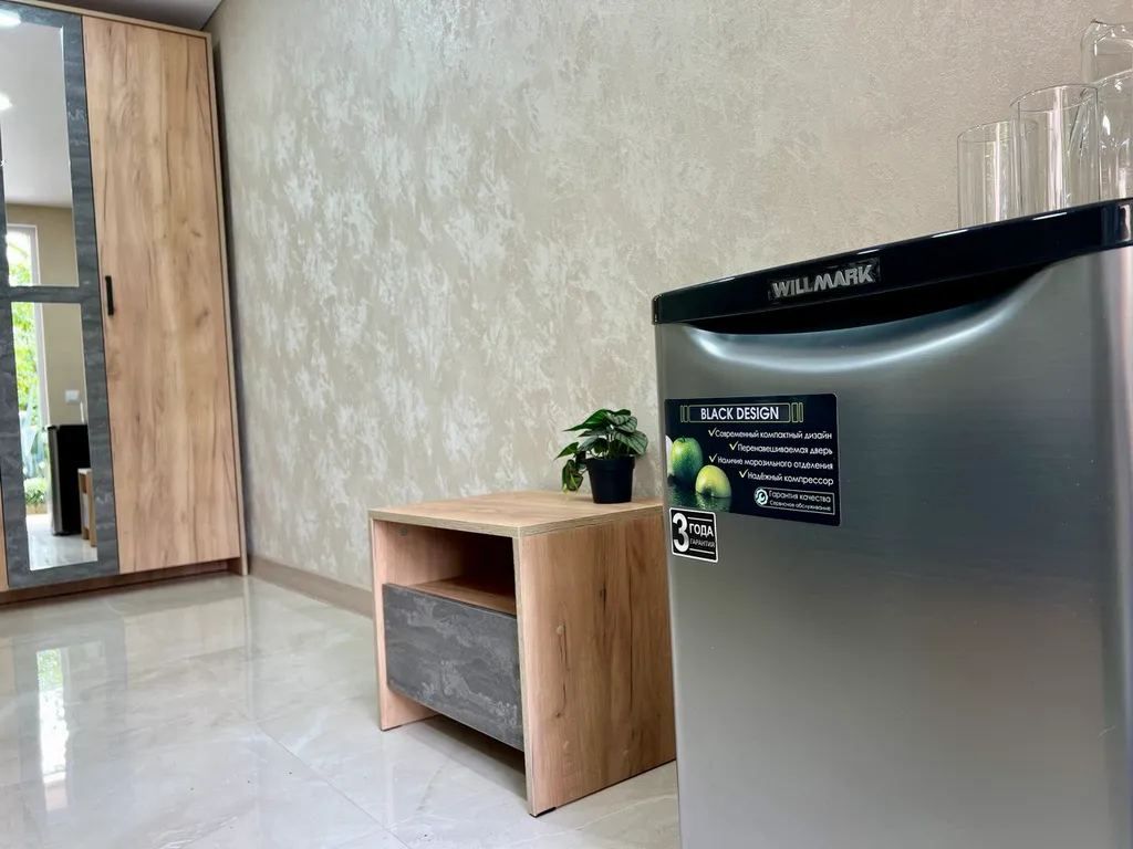 В номере: вешалка, диван, зеркало, кровать двуспальная, стол, стулья, шкаф, микроволновая печь, набор посуды, плита электрическая, телевизор, холодильник, электрочайник