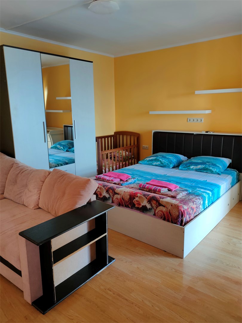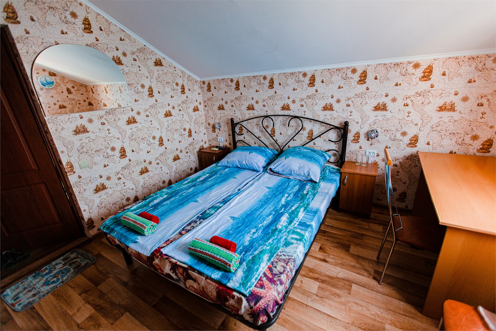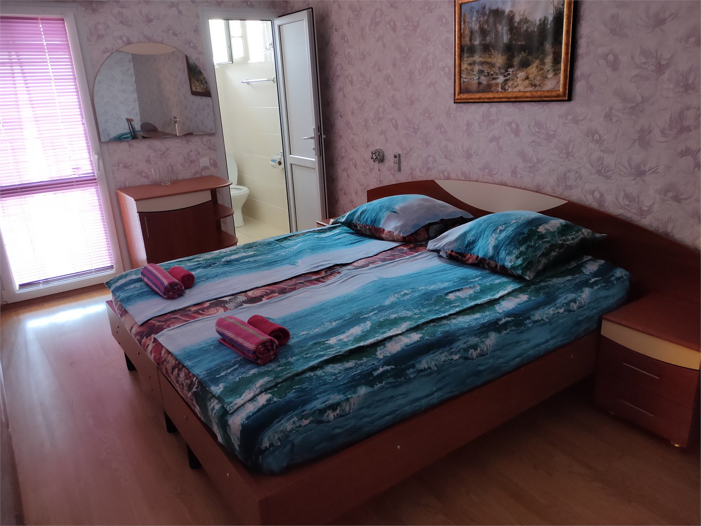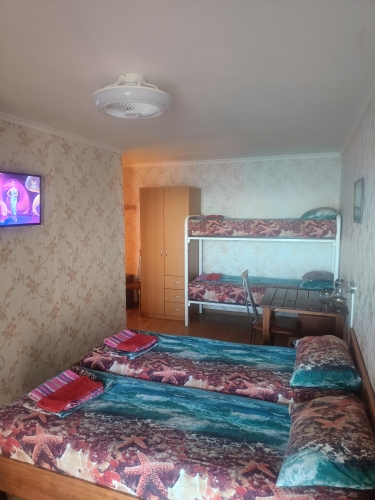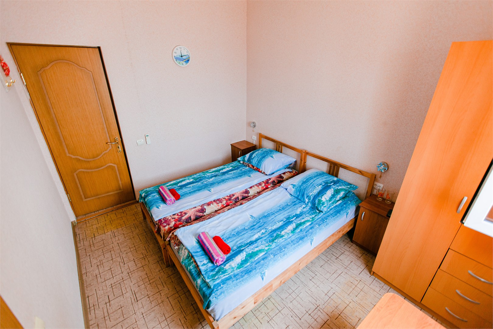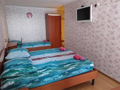 В номере: вешалка, кровать двуспальная, прикроватные тумбочки, шкаф, гладильная доска, пляжные полотенца, сплит-система, телевизор