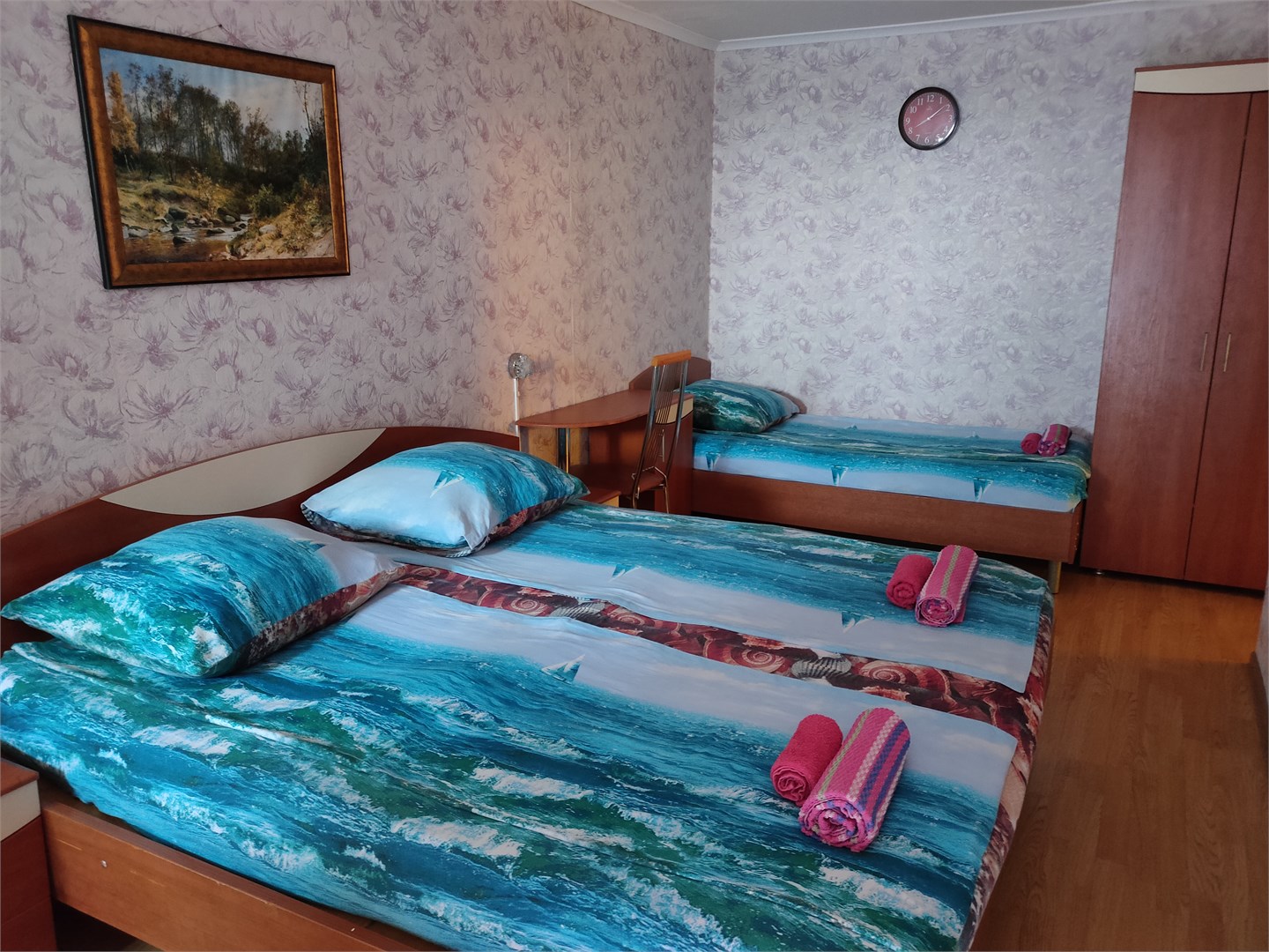 В номере: вешалка, зеркало, кровати односпальные /одна двуспальная кровать, тумба, шкаф, кондиционер, телевизор