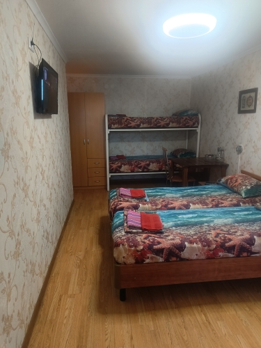 В номере: вешалка, зеркало, кровати односпальные, кровать двуспальная, прикроватные тумбочки, кондиционер, телевизор