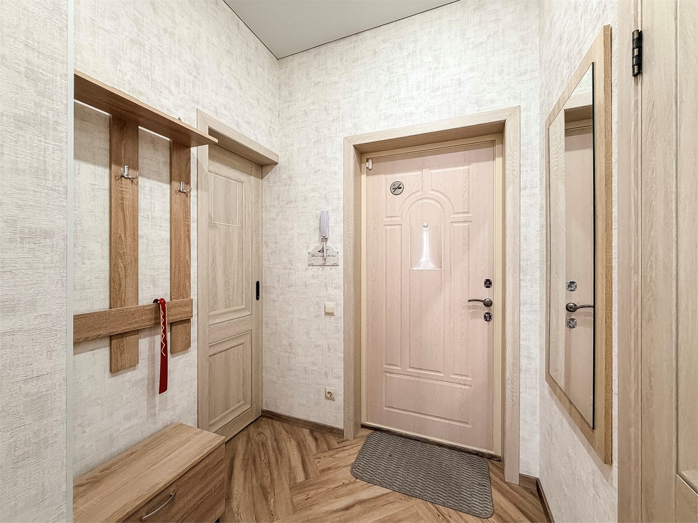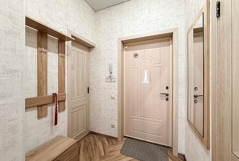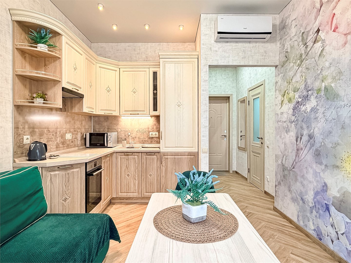 В номере: вешалка, гардеробная, диван раскладной, зеркало, кровать двуспальная, кухонная мебель, прикроватная тумбочка, стол, стол обеденный, стулья, шкаф, гладильная доска, духовой шкаф, кондиционер, микроволновая печь, набор посуды, плита индукционная, посудомоечная машина, стиральная машина, сушилка для белья, телевизор ЖК, утюг, холодильник, чайный набор посуды, электрочайник