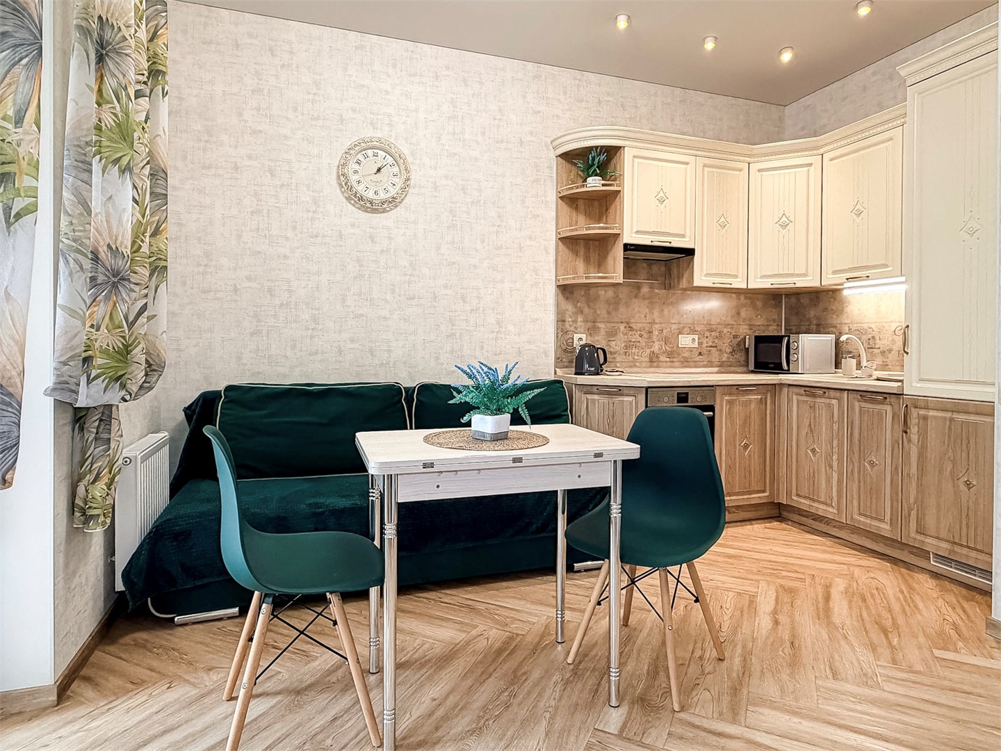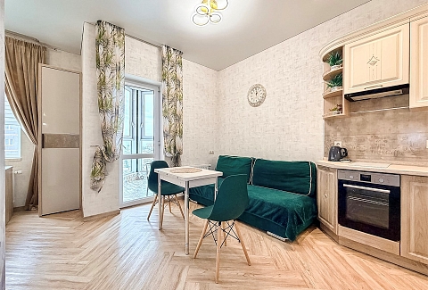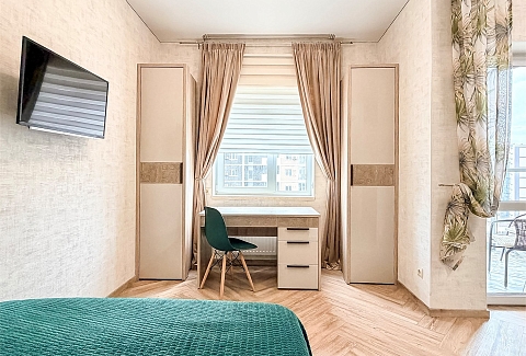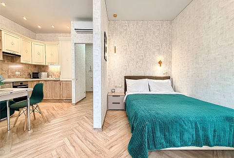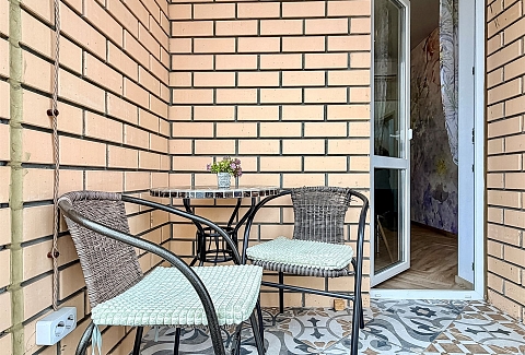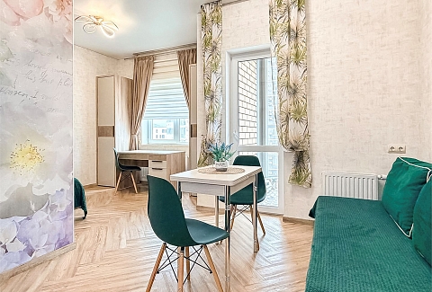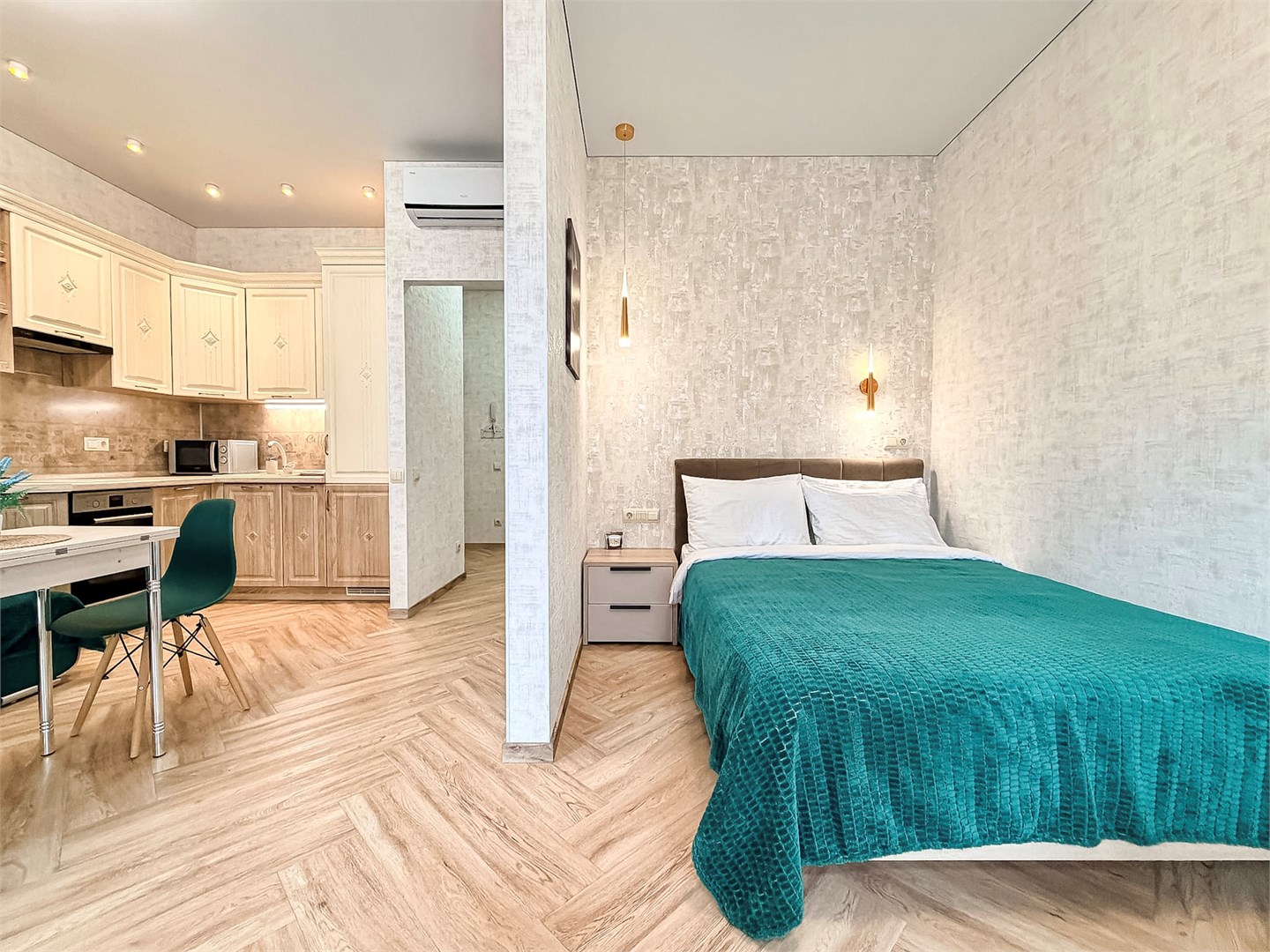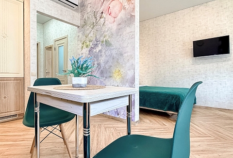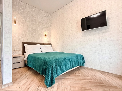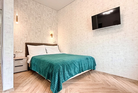 В просторном номере созданы все условия для комфортного проживания: двуспальная кровать с ортопедическим матрасом, раскладной диван, полноценная кухонная зона с индукционной плитой, духовым шкафом, посудомоечной машиной и всей необходимой техникой. Апартаменты оснащены кондиционером, стиральной машиной, телевизором со Smart TV и высокоскоростным Wi-Fi. Для гостей на автомобиле предусмотрена парковка на территории жилого комплекса.Всего в трех минутах ходьбы начинается галечный городской пляж, а рядом расположены популярные зоны отдыха: пляж у яхт-клуба «Русское море», Центральный пляж и пляж «Мыс Любви».