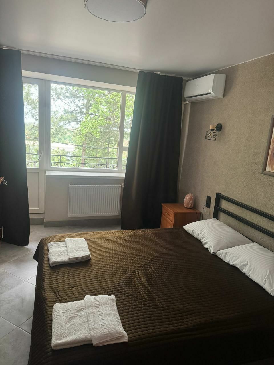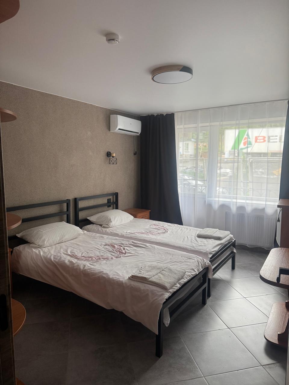 В номере: вешалка, зеркало, кровати односпальные, кровать двуспальная, прикроватные тумбочки, стол, стул, шкаф, мини-холодильник, сплит-система, телевизор
