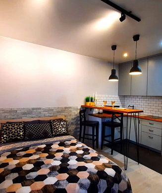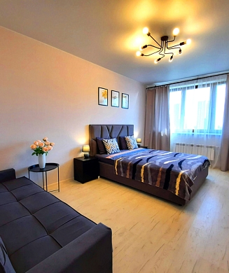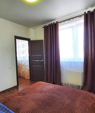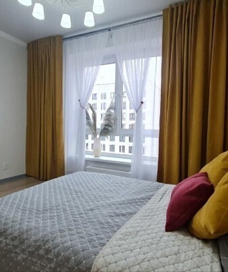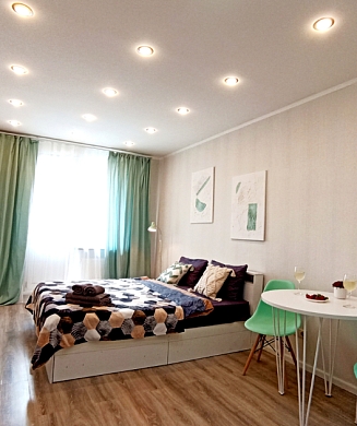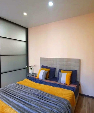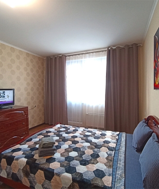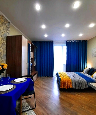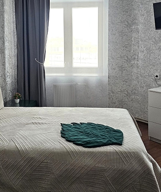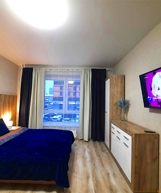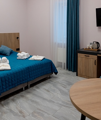 В номере: диван, зеркало, кровать двуспальная, прикроватные тумбочки, стол, стулья, шкаф, микроволновая печь, мини-холодильник, телевизор, чайник, электрочайник