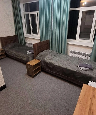 В номере: зеркало, кровати односпальные, прикроватные тумбочки, стол, стул, шкаф, телевизор, электрочайник