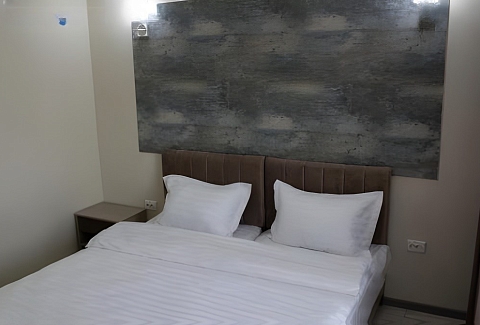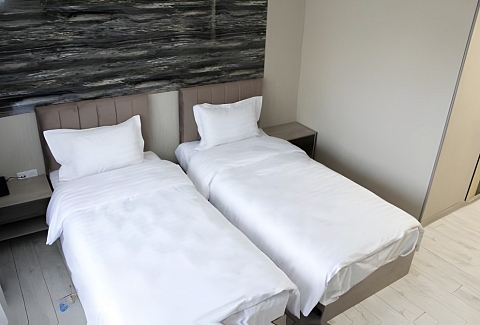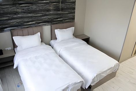 В номере: вешалка, зеркало, кровати односпальные, прикроватные тумбочки, стол, стул, шкаф, кондиционер, телевизор, телефон, чайный набор посуды, электрочайник