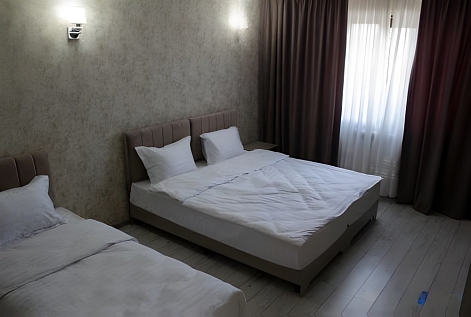 В номере: вешалка, зеркало, кровати односпальные, кровать двуспальная, прикроватные тумбочки, стол, стул, шкаф, кондиционер, телевизор, телефон, чайный набор посуды, электрочайник