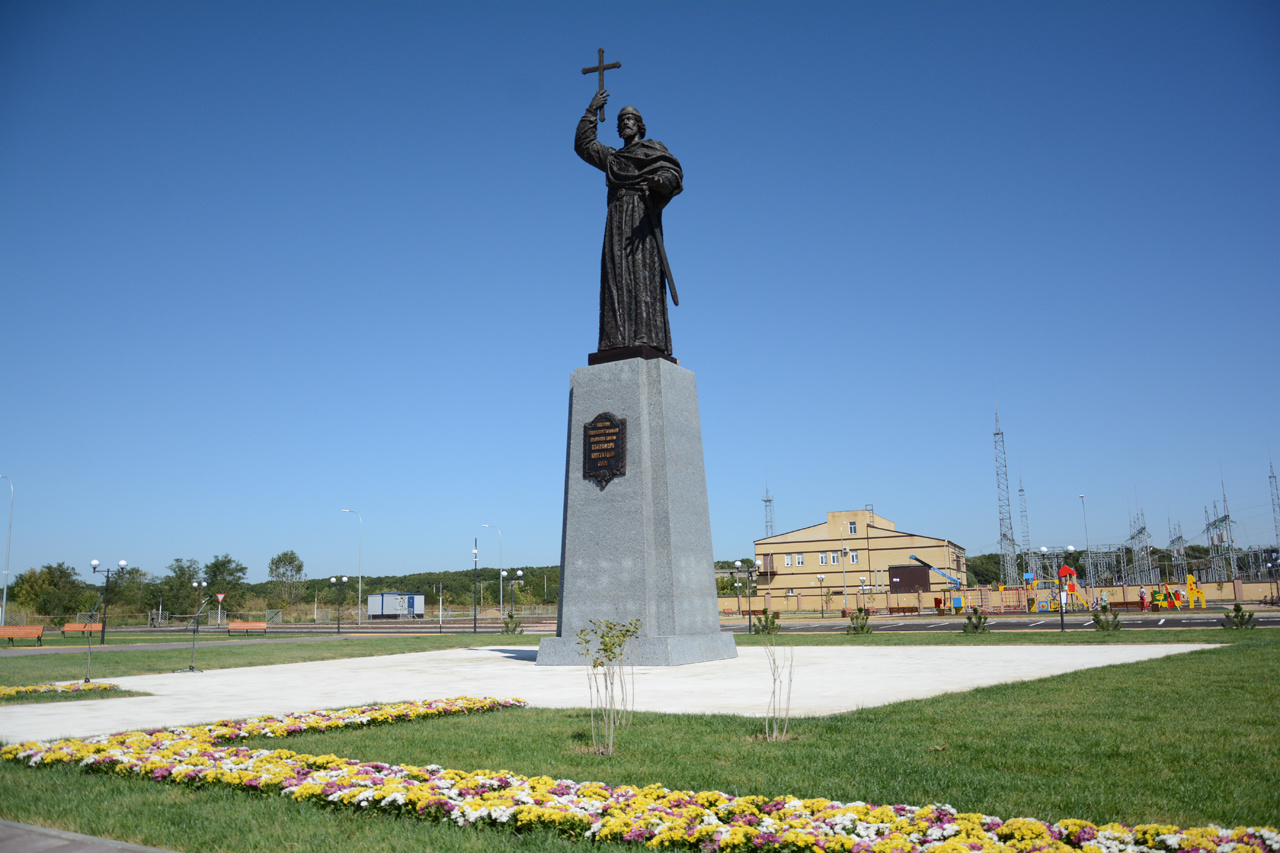 Ее украшает памятник крестителю Руси — князю Владимиру, а также огромный светомузыкальный фонтан. Гранитно-мраморную чашу окружают скульптуры, олицетворяющие федеральные округа РФ. Тридцатиметровые водные струи подсвечивают разноцветные огни, сопровождает музыка и лазерное шоу.